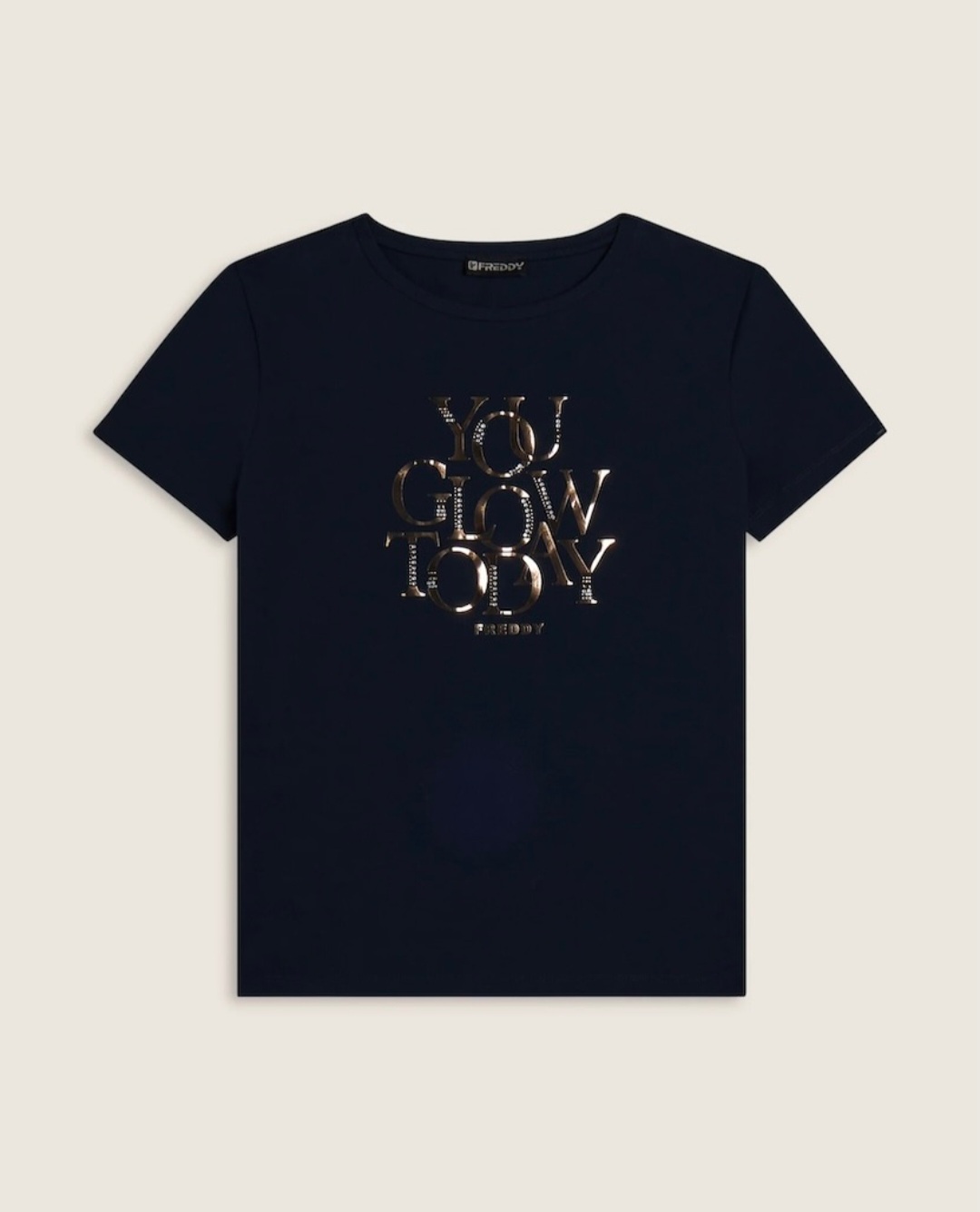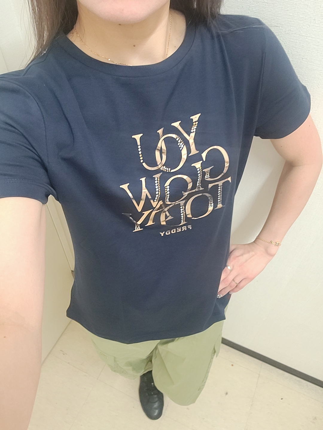 October 8, 2025 ☆Today’s FREDDY☆ 今日は新作のこちら!! ゴールドのキラキラ文字にストーンが可愛い1着✨️ これ1枚でオシャレがキマるTシャツです👕💕 私はキラキラが目立つようにネイビーをチョイスしました✨️ 秋のコーデにピッタリハマります!! ★カラー展開★ B109=ネイビー N=ブラック W101=ホワイト Z25=ベージュ 私はMサイズ着用してます🎵 皆様、お早めにチェックして下さいね🙌 Tシャツ